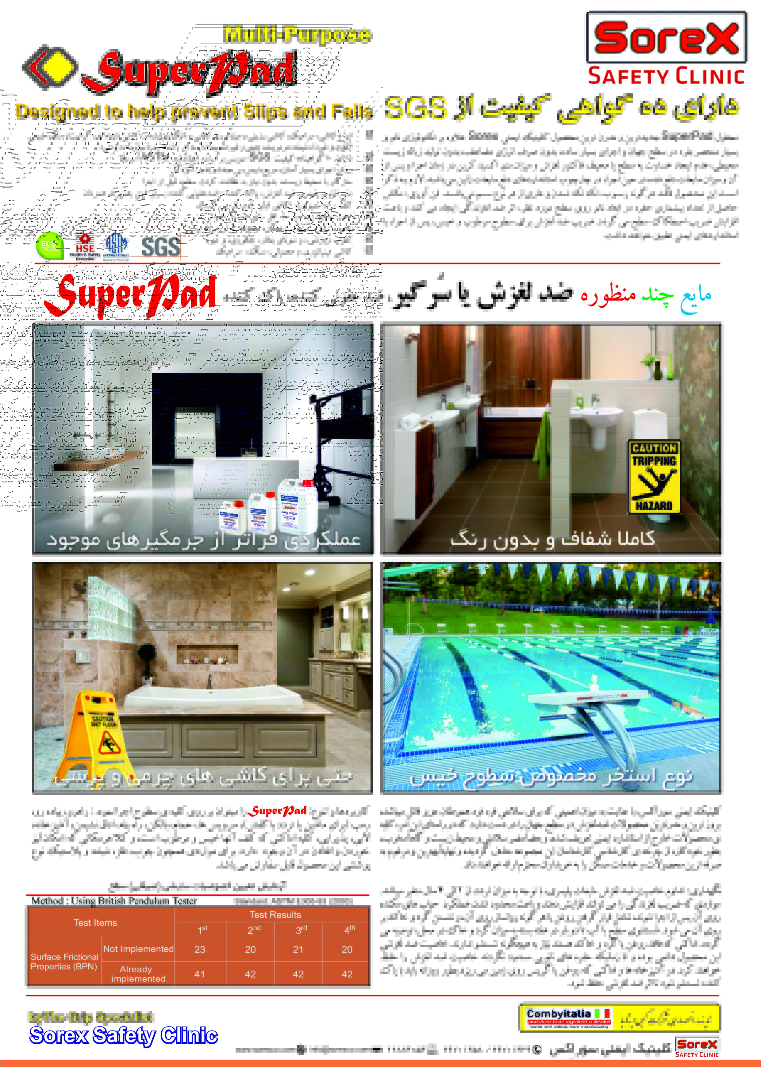 محلول SuperPad، جدیدترین و مدرن ترین محصول کلینیک ایمنی Sorex، علاوه بر تکنولوژی نانو و بسیار منحصر بفرد در سطح جهان و اجرای بسیار ساده، بدون صرف انرژی مضاعف، بدون تولید زباله زیست محیطی، عدم ایجاد خسارت به سطح یا محیط،  و در چارچوب استانداردهای دفع مایعات ژاپن می­باشد. لازم به ذکر است این محصول فاقد هرگونه رسوب، تکه تکه شدن و عاری از هر نوع سم می­باشد.
